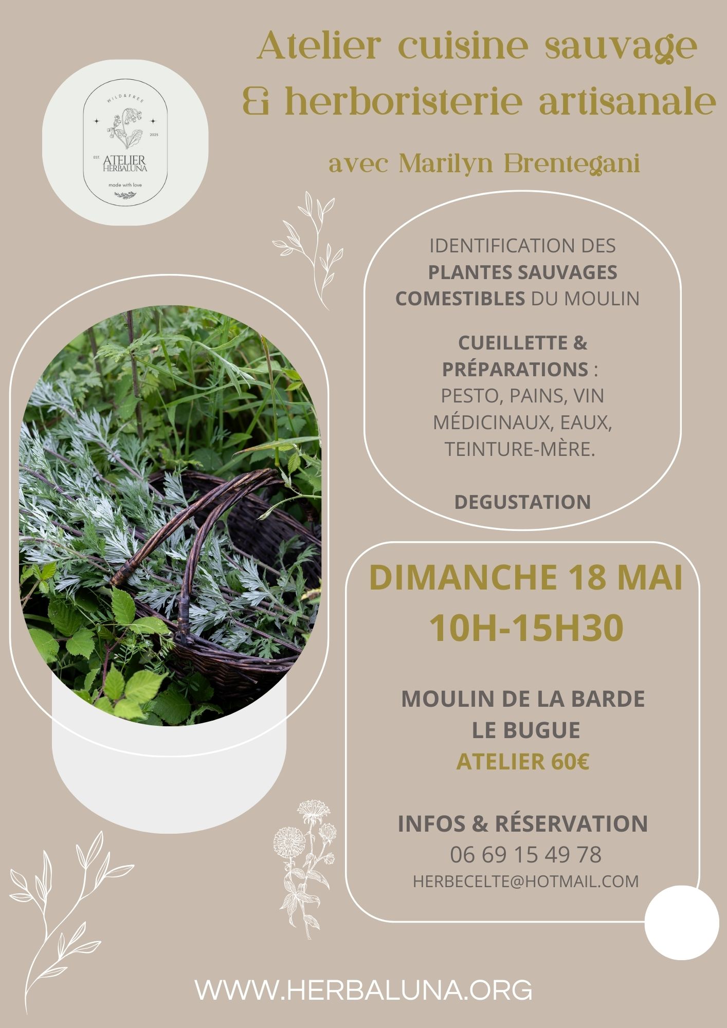 *Un accueil au Moulin de la Barde par Louise. *Une découverte des plantes médicinales sauvages & cueillette qui aura lieu la matin, suivi d’un atelier cuisine participatif. *Un repas partagé, à base d’ingrédients bio, locaux et de saison ainsi que les mets préparés avec les plantes cueillies. *Des tisanes, eaux de plantes sauvages et vins médicinaux avant et durant le repas. *Les recettes transmises lors de l’atelier. *Une teinture-mère d’une plante sauvage sera préparée l’après-midi.