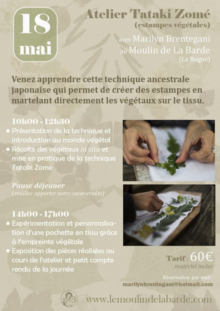 Samedi 8 mars 2025 Atelier empreintes végétales Tatakizome. Moulin de la barde. Le Bugue. DOrdogne. Inscriptions marilynbrentegani@hotmail.com